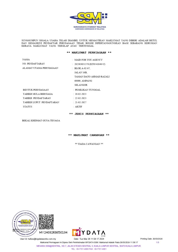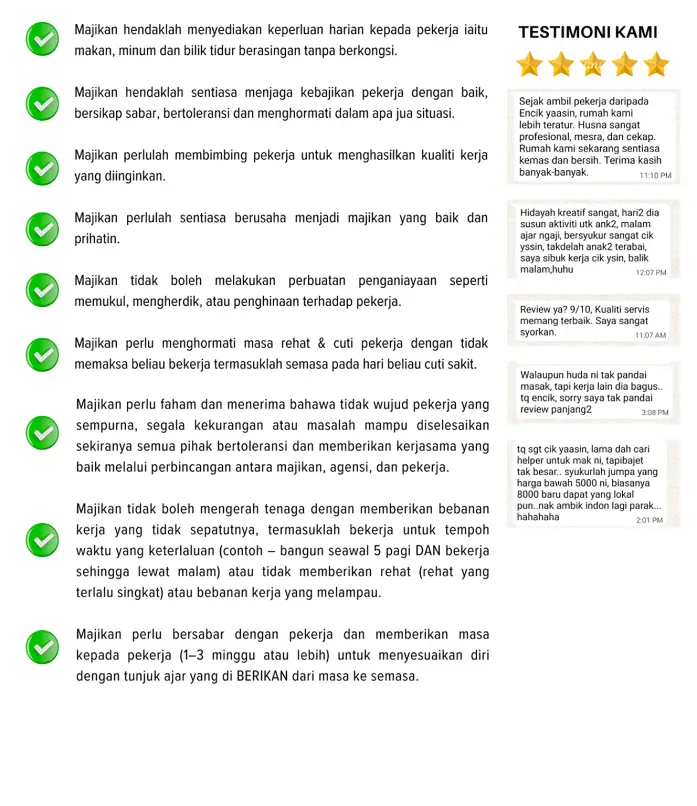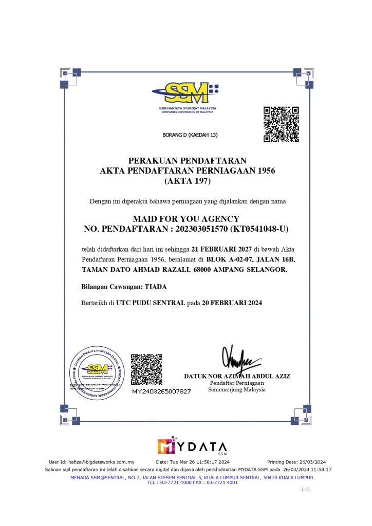 Adalah agensi pekerjaan yang telah beroperasi sejak 2021 dan secara rasminya telah mendaftar perniagaan di bawah Suruhanjaya Syarikat Malaysia pada tahun 2023, yang berdedikasi untuk menyediakan pekerja tempatan yang berkualiti dan boleh dipercayai sebagai pembantu rumah, penjaga warga emas, dan penjaga kanak-kanak. Kami memahami bahawa kehidupan yang sibuk dan tanggungjawab yang pelbagai memerlukan bantuan profesional yang boleh diandalkan untuk menjaga rumah dan orang tersayang.