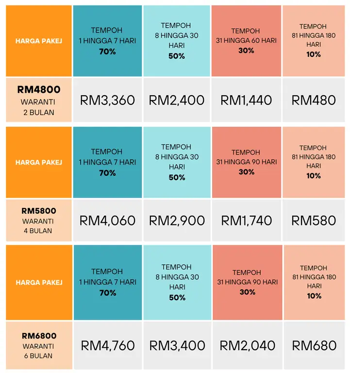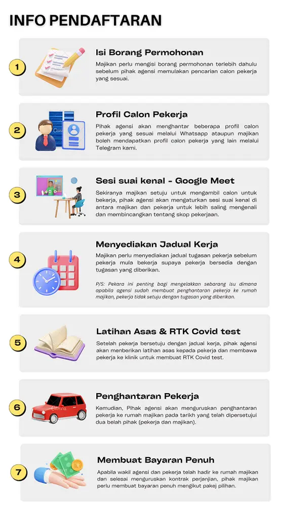 Tiada bayaran deposit diperlukan atau booking, bayaran setiap pilihan pakej di bawah hanya perlu di bayar sepenuhnya apabila wakil agensi dan pekerja hadir ke rumah majikan sahaja.