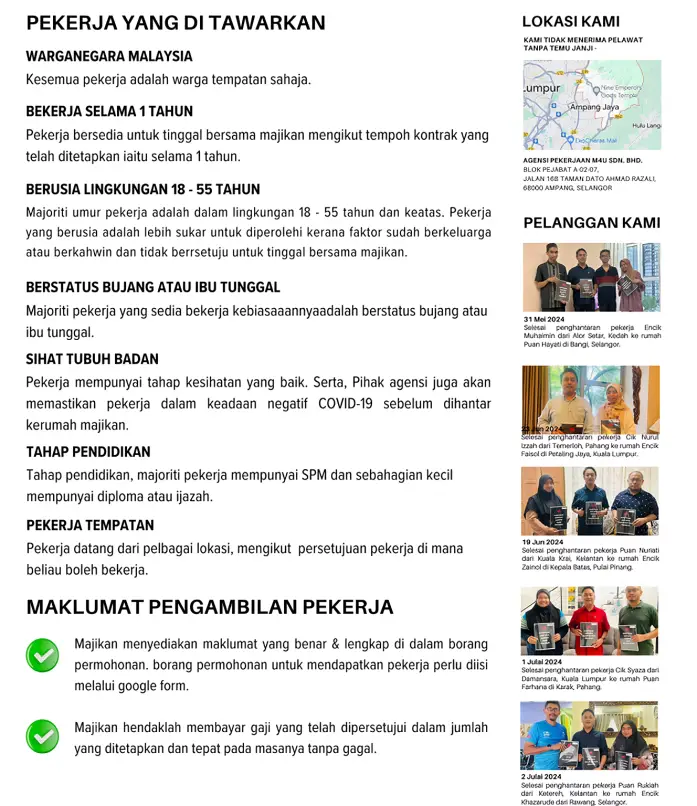 Berikut adalah soalan-soalan yang menjadi kebiasaan para majikan yang ingin mengambil pekerja daripada syarikat kami. Dengan bantuan soalan-soalan ini, kami berharap sedikit sebanyak dapat membantu menjawab segala persoalan majikan dan lebih menjimatkan masa.